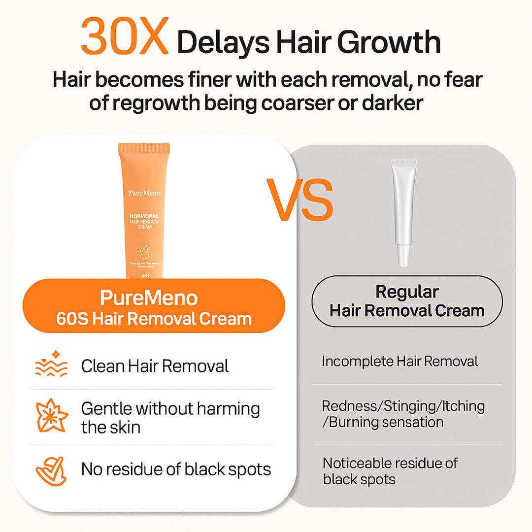 Traditional hair removal methods are often painful, harsh, and short-lived, leaving skin irritated and confidence low. Puremeno Hormonal Hair Removal Cream offers a better way by gently removing unwanted hair while hydrating, restoring firmness, and delivering lasting smoothness for menopausal skin.
